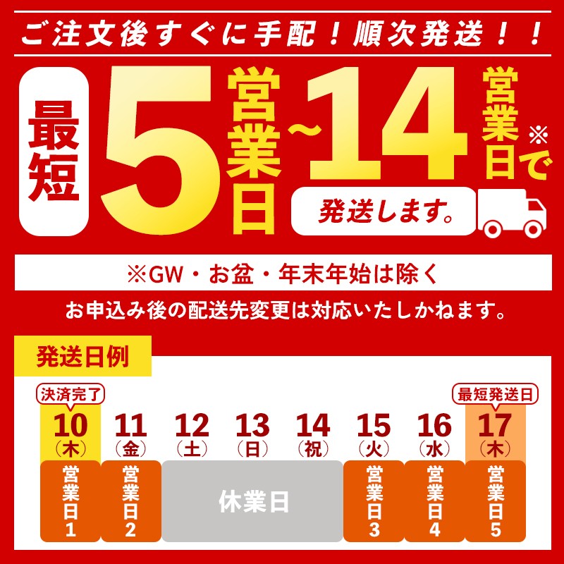 | 発送期日 | 5〜14営業日で発送(年末年始など繁忙期は除く) |