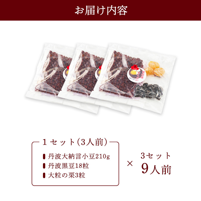 | 容量 | ・1セット(3人前)×3 計9人前 ・1セット(3人前)×4 計12人前 ・1セット(3人前)×6 計18人前 ※1セット(3人前):丹波大納言小豆210g、丹波黒豆18粒、大粒の栗3粒 |