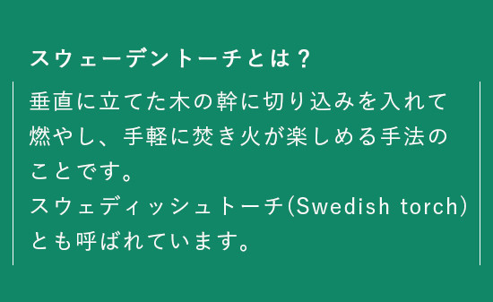 スウェーデントーチは、垂直に立てた木の幹に切り込みを入れて燃やし、手軽に焚き火が楽しめる手法のことです。別名・スウェディッシュトーチ(Swedish torch)とも呼ばれています。