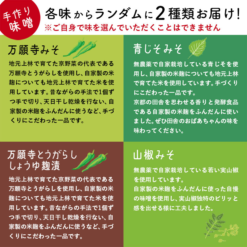 | 容量 | ・手作りみそ2種 下記のいずれか2種 ※種類はお選びできません。 山椒みそ 青じそみそ 万願寺唐辛子しょうゆ麹漬 万願寺みそ 各100g ・さつまいもクッキー:1袋(5枚入り) ・楮クッキー:1袋(7個入り) ▼原材料▼ ●青じそみそ:青じそ(京都府綾部産)、醤油(大豆・小麦を含む)、米麹(すまいる工房製)、砂糖、みりん ●山椒みそ:味噌(大豆、米麹、塩) (国內製造)砂糖、実山椒(京都府綾部産)、みりん ●万願寺唐辛子しょうゆ麹漬:万願寺唐辛子(京都府綾部産)、醤油(大豆・小麦を含む)、米麹(すまいる工房製)、みりん 、砂糖、酒 ●万願寺みそ:万願寺唐辛子(京都府綾部産)、米麹(すまいる工房製)、醤油(大豆小麦を含む)、砂糖 ●さつまいもクッキー:小麦粉(北海道産)、さつまいも(綾部産)、甜菜糖、米油、片栗粉、紫芋パウダー ●楮クッキー::小麦粉(北海道産)、甜菜糖、米油、片栗粉、無調整豆乳、楮(葉、綾部市産) |