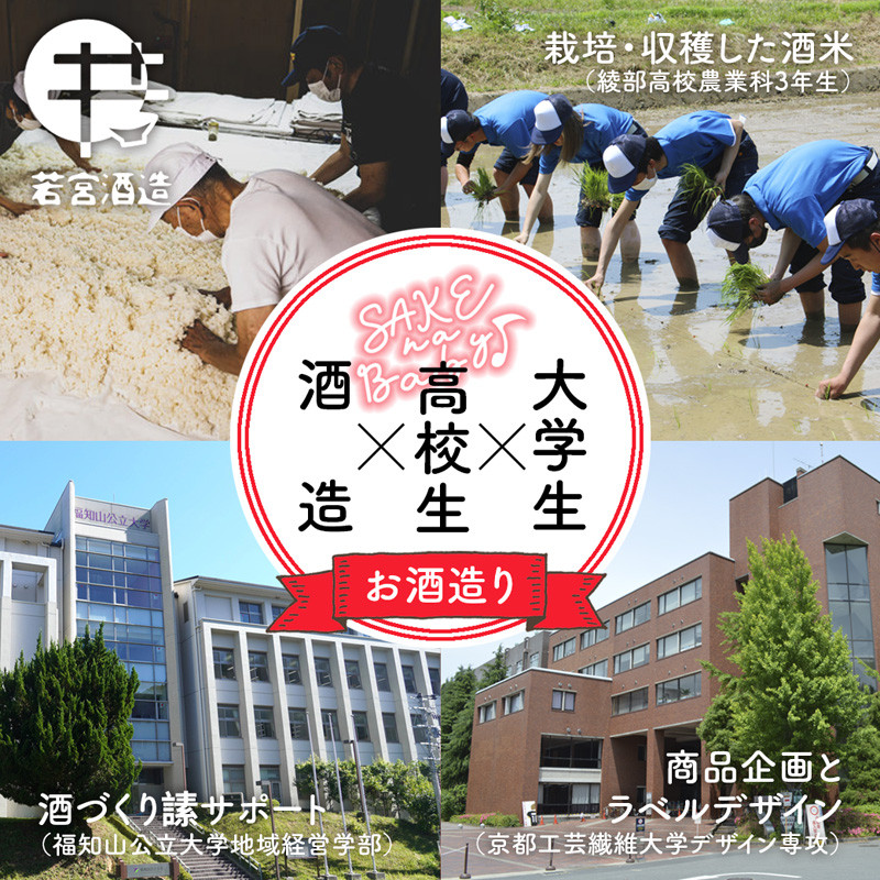 京都府綾部市の綾部高校農業科3年生が栽培・収穫した酒米「五百万石」を使い、京都工芸繊維大学デザイン専攻の私たちが商品企画とラベルデザインを担当し、福知山公立大学地域経営学部の学生が酒づくりのサポートを担当してつくられました。