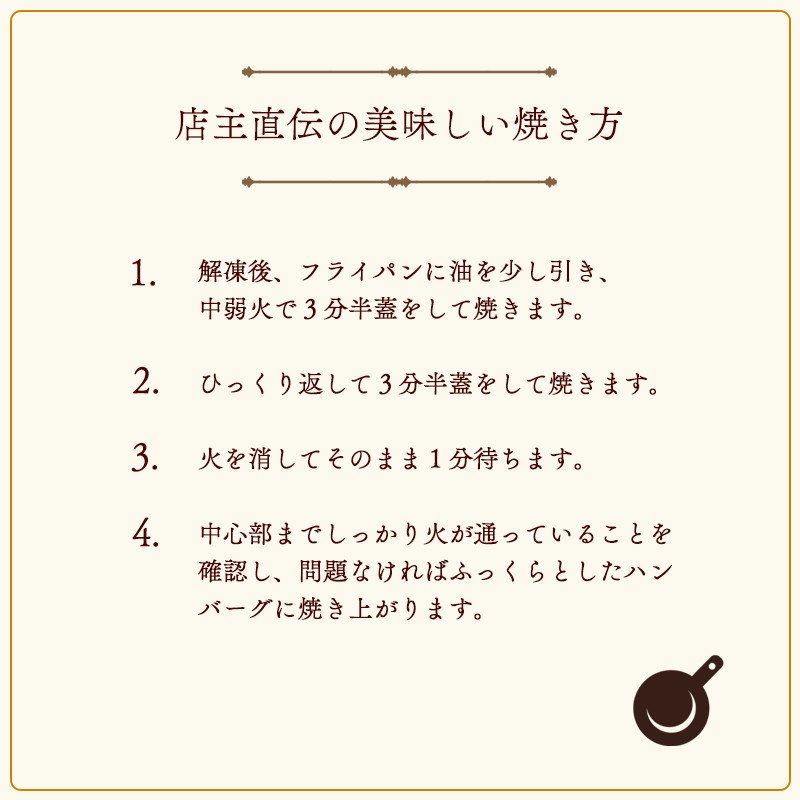 お召し上がりの際は、解凍後弱火でじっくりと火を通すことで、肉汁がしっかりと閉じ込められ、ジューシーさが存分に楽しめます。