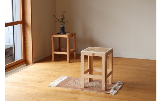 伝統的な木組みの技法を用いて薄い材で構成したスツール。