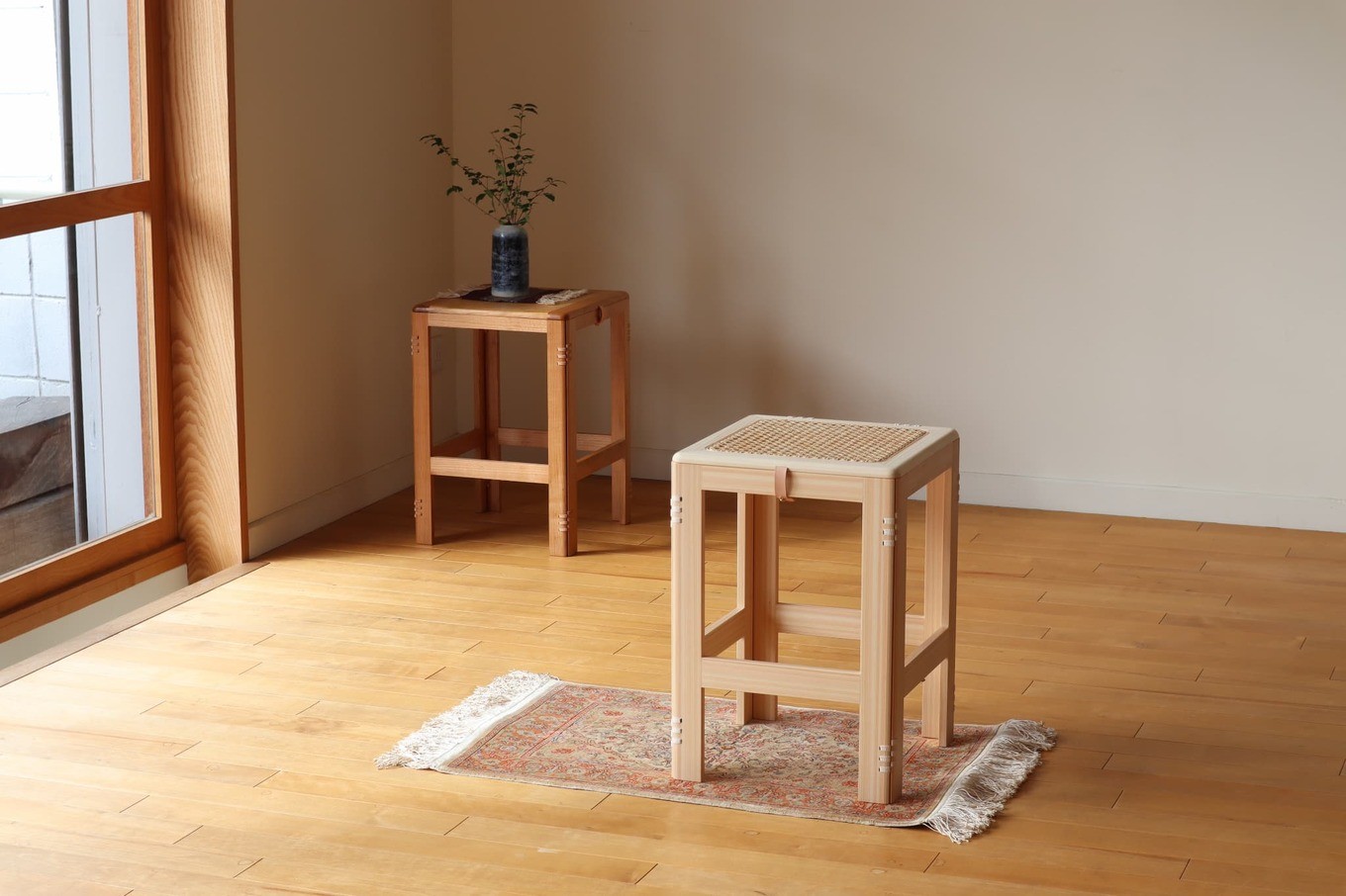 伝統的な木組みの技法を用いて薄い材で構成したスツール。