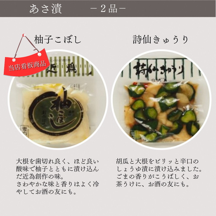 「近為」創作の味「柚こぼし」をはじめ、素材の味を生かした浅漬けと、日持ちの良い深漬をバランスよくお詰め合わせした「京つけもの」をご堪能くださいませ。