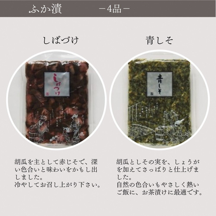 | 容量 | 柚こぼし×1 詩仙きゅうり×1 しばづけ×1 青しそ×1 味すぐき×1 柚こしょうごぼう×1 |