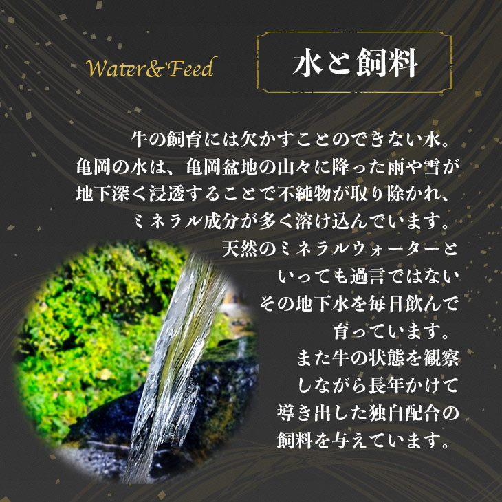 亀岡市は美しい水と空気にめぐまれたのどかな田舎町です。夏と冬の気温差は35℃以上と牛には厳しい環境ですが、その環境が身を引き締め、とても美味しく格別な味にしております。生産農家は飼育にこだわりを持っております。他のブランド肉と違うのは、亀岡では2ヶ月~半年ほど長く飼育して牛が成熟するのを待ちます。そうする事によりお肉の風味や油の艶を引き出し、からっとしたしつこくない味に仕上げております。