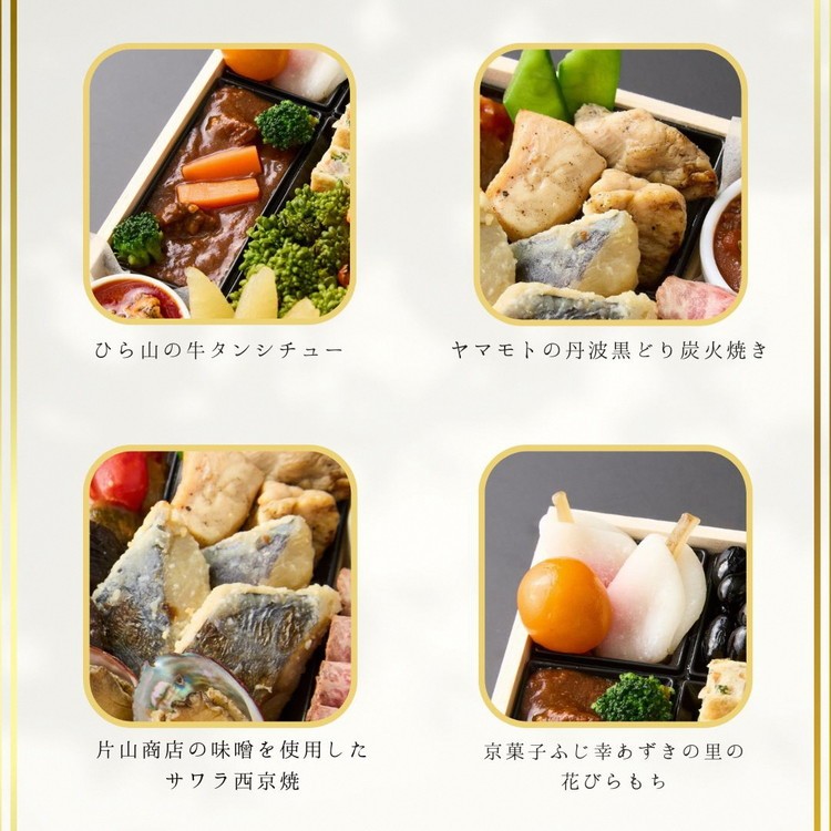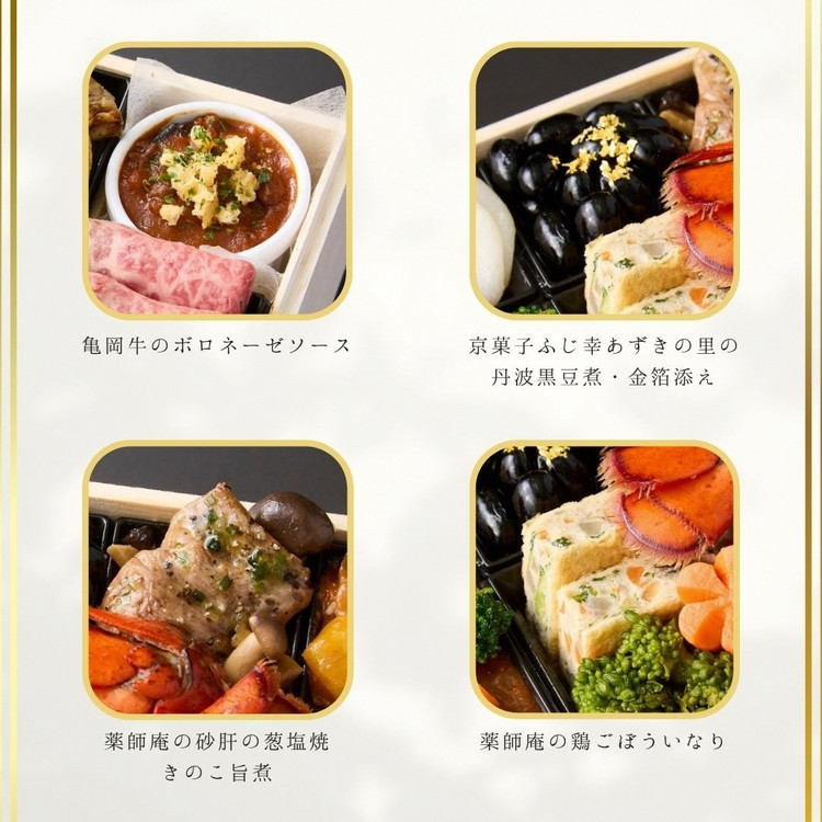 京菓子ふじ幸あずきの里の花びら餅と丹波黒豆煮、薬師庵(株)の砂肝の葱塩焼、きのこ旨煮と鶏ごぼういなり、(株)ヤマモトの丹波黒どり炭火焼、亀岡牛のボロネーゼソース、ローストビーフやしぐれ煮、ひら山の牛タンシチュー、(株)近為の菜の花漬け、(株)もりのだしおりーぶ、ごぼう醤油漬けとたけのこ山椒煮、(株)片山商店の味噌を使用したサワラ西京焼、(株)サンフェステの紫芋焼酎を使用したあわび煮、京都・亀岡産九条ねぎのすき焼き風煮など、京都丹波の食材・逸品を取り入れた和洋風おせち料理です。