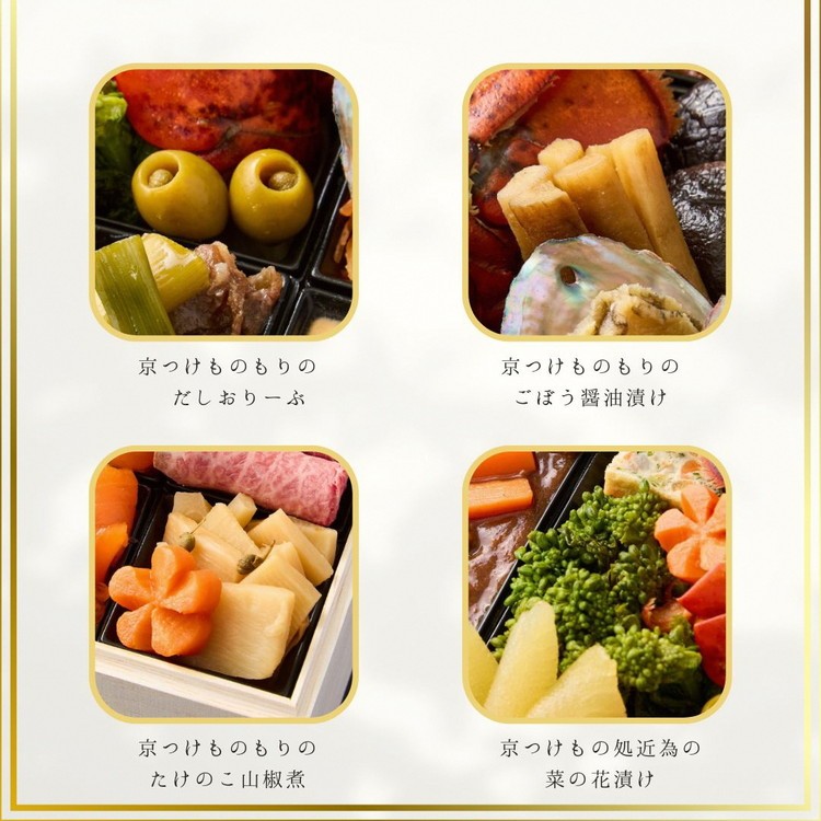 京菓子ふじ幸あずきの里の花びら餅、京菓子ふじ幸あずきの里の丹波黒豆煮・金箔添え、薬師庵の砂肝の葱塩焼、薬師庵のきのこ旨煮、ラタトゥイユ、ヤマモトの丹波黒どり炭火焼、きぬさや煮、茄子と亀岡牛のボロネーゼソース、ひら山の牛タンシチュー、薬師庵の鶏ごぼういなり、近為の菜の花漬け、オマールのコンフィ、もりのだしおりーぶ、しいたけ煮、もりのごぼう醤油漬け、片山商店の味噌を使用したサワラ西京焼、サンフェステの紫芋焼酎を使用したあわび煮、人参のオレンジマリネ、亀岡牛のローストビーフ、ビーンズデミグラスソース煮、魚介のエスプレット唐辛子ソース・ピスタチオ添え、味付数の子、松前漬け、亀岡牛のしぐれ煮、京都・亀岡産九条ねぎのすき焼き風煮、海老のムース・キャビア添え、いくら醤油漬け、スモークサーモントラウト、もりのたけのこ山椒煮、金柑甘露煮、梅型ねじり人参煮