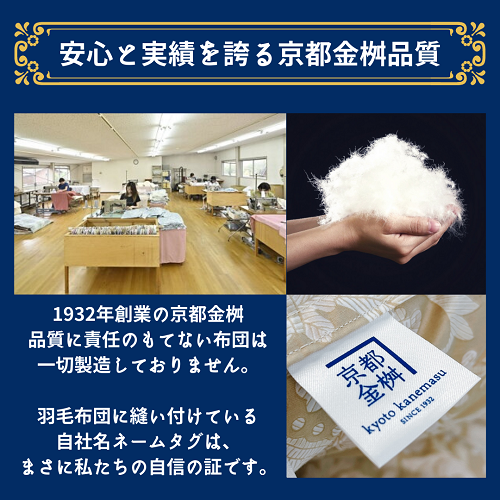 1964年より製造を始めた老舗、株式会社京都金桝 亀岡工場製の羽毛ふとんです。