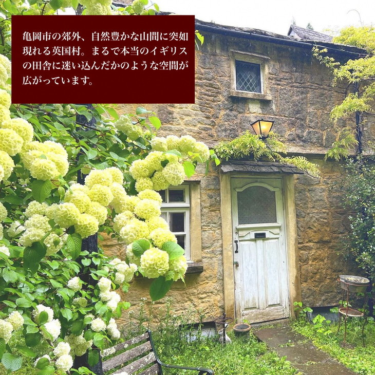 京都府亀岡市にある英国村です。レストランと少しのストアーが皆様をお迎えしています。レストランレセプションから奥に続く小道をゆくと、2階建てコテージが連なった御宿泊者様しか入れないB&Bエリアです。チャペルやパブがあり、静かでノスタルジックな時間を楽しんで頂けます。