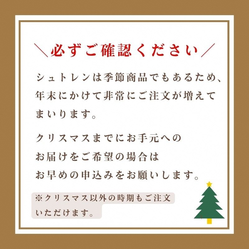 数年前から毎年申し込んでいます。中の果実も豊富で、周囲の生地のしっとりした感じも良く、とても美味しいので、いつもクリスマス前に食べ終わってしまいます。他の店のシュトーレンも色々頼んでみましたがこのお店が一番。