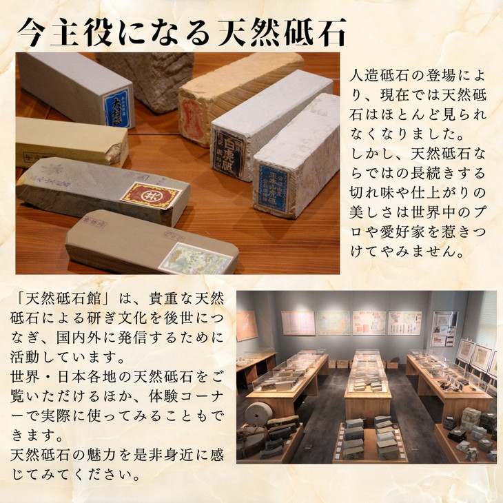 本返礼品では、天然砥石の魅力を身近に感じられる『天然砥石館』で、包丁研ぎの秘訣を伝授します。