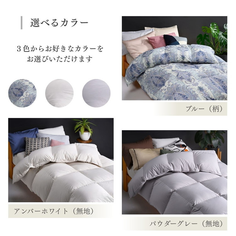 キルトは立体キルトで、暖かい空気を逃がさず、体にフィット。側生地にはレーヨン混紡生地を採用し、しっとりなめらかな肌触りを実現しました。高貴でエキゾチックな柄(ブルー)と、シンプルで飽きのこない無地(落ち着きのあるアンバーホワイト・柔らかい印象のパウダーグレー)を、バリエーション豊かにご用意しました。無地の側生地は「白っぽいカバーで柄が透ける」といったお悩みも解消します。