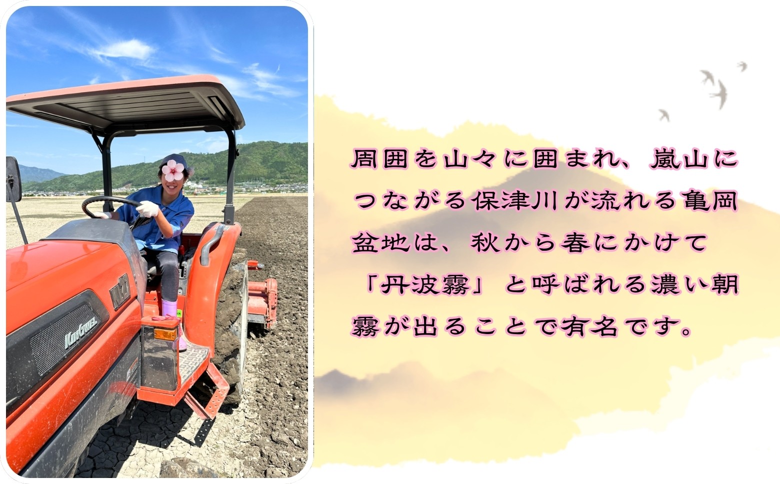 また、秋から冬にかけて亀岡盆地一帯を包む「丹波霧」の風景は、それにより育まれる地域の特産物とともに、亀岡市の魅力を象徴しています。
