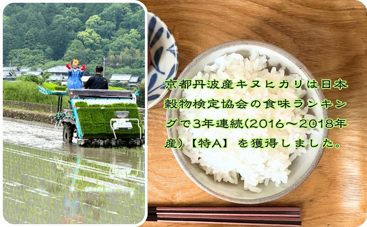 日本穀物検定協会の食味ランキングで京都丹波産キヌヒカリは3年連続(2016〜2018年産)「特A」を獲得しました。
