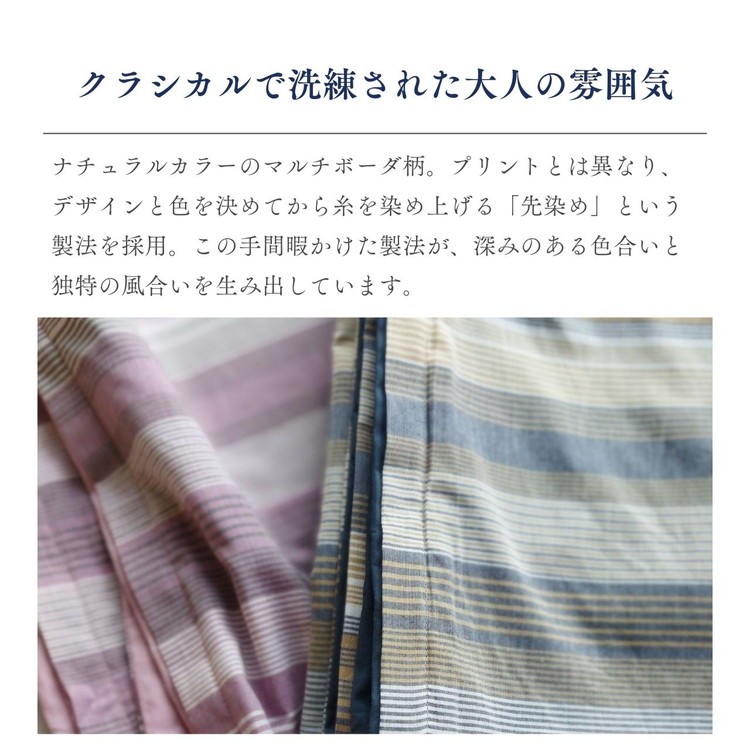 デザインは落ち着いたナチュラルカラーで表現したマルチボーダー柄。カジュアルでありながらも、どこかクラシカルで洗練された大人の雰囲気を醸し出します。その魅力は、縦糸と横糸が織りなす豊かな色彩にあります。プリントとは異なり、デザインと色を決めてから糸を染め上げる「先染め」という製法を採用。染め上げた糸を横糸に、縦糸にはオフホワイトを使用し、丁寧にボーダー柄へと織り上げています。この手間暇かけた製法が、深みのある色合いと独特の風合いを生み出しています。裏面には、それぞれのカラーに合わせた専用の無地を採用し、細部までこだわったデザインとなっています。
