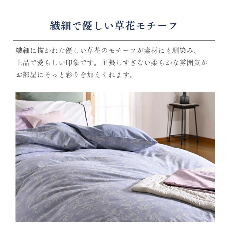 繊細な草花のモチーフと上質な素材が織りなす優しい印象が魅力の枕カバー。素材の60ローンという薄手の平織り生地は、上品なタッチでサラリと軽く、しなやかな肌触り。速乾性にも優れているため、お洗濯後の扱いやすさもポイントです。その軽さが心地よい眠りを誘います。裏面には、それぞれのカラーに合わせた専用の無地を採用し、細部までこだわったデザインとなっています。