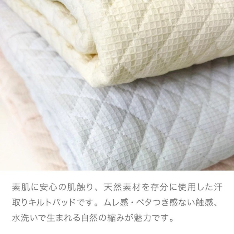 素肌に安心の肌触り、天然素材を存分に使用した汗取りキルトパッドです。ムレ感・ベタつき感ない触感、水洗いで生まれる自然の縮みが魅力です。ワッフル素材と細かなキルトの凸凹効果で体が密着せず、通気性のある爽やかな寝心地です。表地裏地共に綿100%、中綿は吸水性とクッション性を叶えた二重構造です。キルトの丈夫さも魅力。体を支える中央は細かなしっかりキルト、天地には細いボーダーキルト。2種類のキルトをつなげたデザインは全てのサイズに幅継ぎがありません。