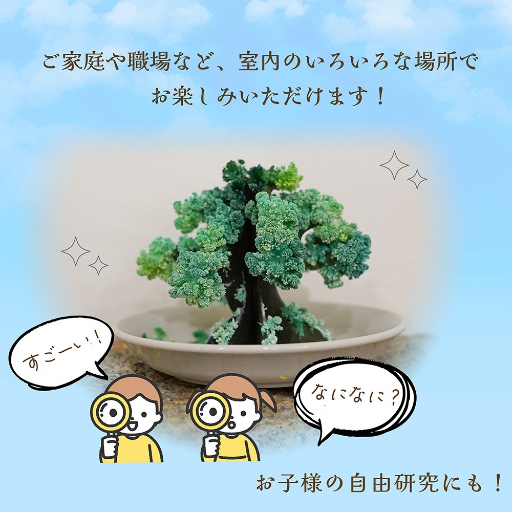 桜の咲き始めから満開までお楽しみいただける「京の桜」、葉が茂り葉が散っても再生できる「京の盆栽」、枯れ葉が雪化粧する「京の樹氷」の3種類をセットでお届けします。桜の花、葉、雪は、開花液の中に含まれる無機塩が結晶となったものです。無機塩は食品添加剤として使用されており安全なものです。花や葉は散ってもこれらを集めて水に溶かして、紙木材を漬すと繰り返し5回程度咲かすことが可能です。