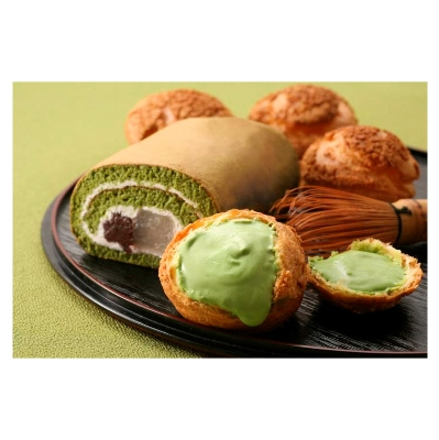 厳選した宇治抹茶をたっぷり使った生地で、自家製のわらび餅、モンドセレクション2020にて金賞を受賞した小豆、手作りの生クリームを巻いた人気のロールケーキとクッキーのシュー皮の中に城陽市内の老舗製造加工問屋で製造された宇治抹茶を使用した抹茶クリームがたっぷり入った抹茶シュークリームの抹茶スイーツのセットです。