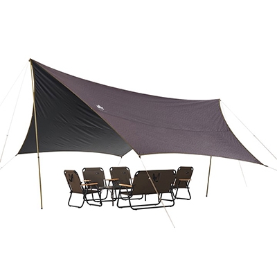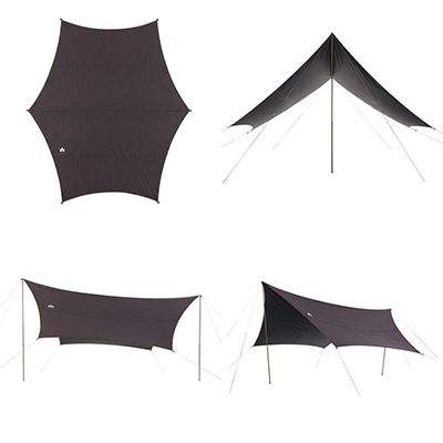 アレンジのしやすさやすぐれた耐風性が特長のヘキサ型タープ。生地には分厚くて丈夫な難燃ヘビーポリオックスを採用し、さらに裏面にはUV-CUT率99.9%、遮光率100%という驚異のスペックを備え、日向と日陰で最大15℃もの温度差を生み出す「ソーラーブロック加工」をプラス。(※LOGOS調べ)