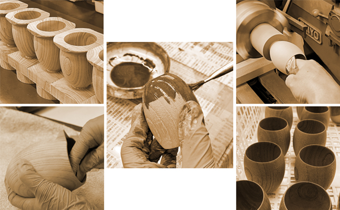 弊社では、長年培ってきた金属・木材加工の技術を生かし、木地作りから漆塗りによる仕上げまで自社で制作しています。どの工程でも心を込めて制作しております。