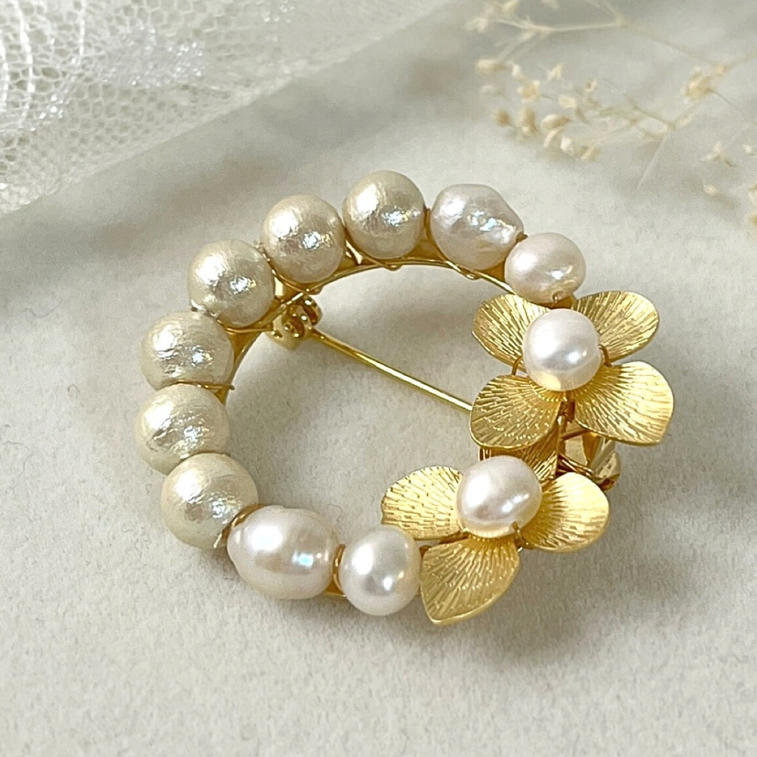 コットンパールと淡水パール、花のパーツを組み合わせることで、高級感を出しつつ気兼ねなく身に付けることができるデザインになっています。