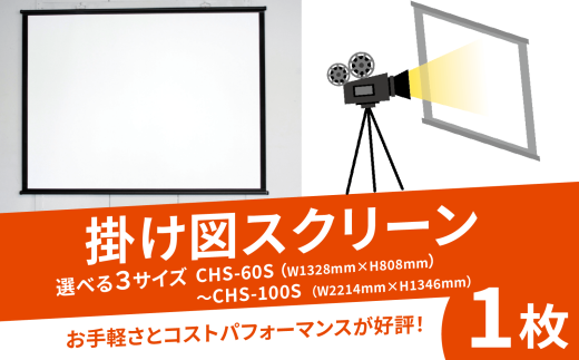 容量 | 掛け図スクリーン 選べるサイズ 3種類 ■CHS-60S (外寸:W1328mm×H808mm) ■CHS-80S (外寸:W1771mm×H1077mm) ■CHS-100S (外寸:W2214mm×H1346mm) ※収納袋付き(巾着型) |