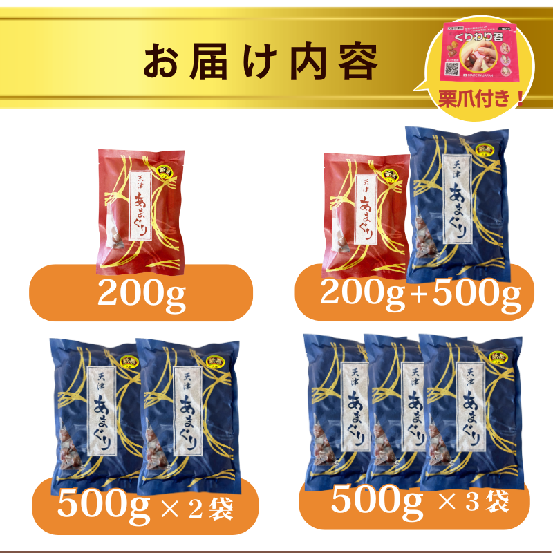 | 容量 | ・200g ・200g+500g(700g) ・500g×2袋(1㎏) ・500g×3袋(1.5kg) ・栗爪1個付き |