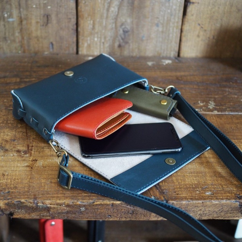 「革綴じ」を用いて制作したショルダーバッグ 革綴じコンパクトポシェット 選べる 6色 牛革 ヤギ革 レザー バッグ ショルダーバッグ ショルダー 革 小物 メンズ レディース おしゃれ 手作り プレゼント ギフト 記念日 贈り物 革工房むくり 八幡市 京都