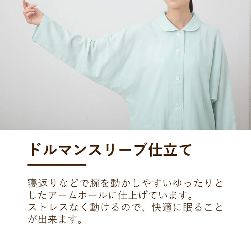 ふんわり柔らかでゆったり着られるレディースパジャマです。生地には和晒しガーゼを使用しています。和晒しとは4日間不純物を取り除くために和晒し釜と呼ばれる大きな釜にゆっくり漬け込みきれいに晒された生地になります。和晒しガーゼは生地にストレスがかかりにくく綿本来の柔らかさを生かした生地になり、今回のパジャマには2重タイプを採用しています。程よい厚みと保温性があり長い季節使用が可能です。