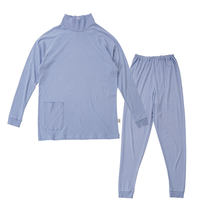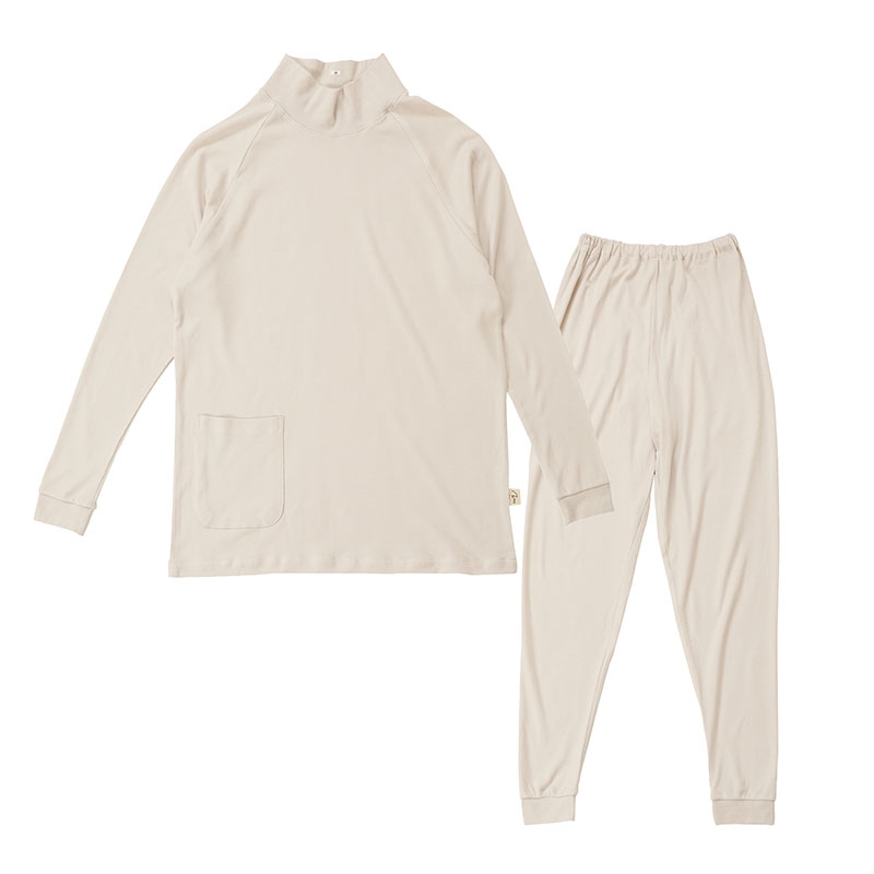 こちらのパジャマはなめらかな肌ざわりと伸縮性に優れています。素材は綿モダールを採用しています。モダールとはシルクのような光沢感となめらかな肌ざわりが特徴であり、綿と合わせることで生地に適度な強度を持たせることができ、ご家庭でも手軽にお洗濯が可能になります。生地は伸縮性に優れるスムースニットに仕上げました。パジャマの仕様にラグランスリーブを採用することで、寝返りなどで感じる生地のツッパリ感が感じにくく快適な睡眠をサポートします。首元と手先、足先はフライス素材を使用することでフィット感を重視しました。