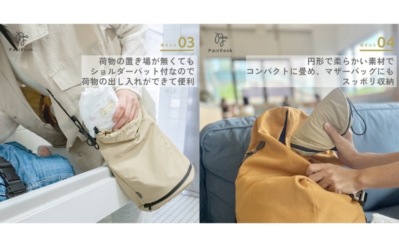 お出かけ先でおむつを交換しようとしたとき、おむつ替えベットで荷物を置けずに困ったことや、ゴミ箱のない公園で困ったことはありませんか?このポーチひとつで全部解決します!
