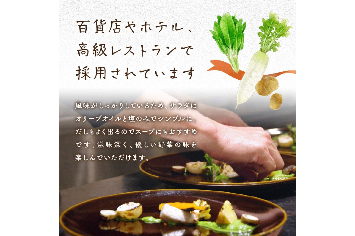 百貨店やホテル、高級レストランでも採用されている弊社の野菜たちは、風味がしっかりしているため、サラダはオリーブオイルと塩のみのシンプルな味付けでお楽しみいただけます。また、「だし」もよく出るのでスープにもおすすめです。滋味深く、優しい野菜の味を楽しんでいただけます。