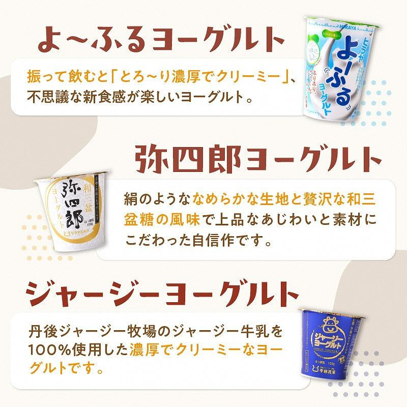 平林乳業が自信を持っておすすめする三種類のヨーグルトを定期便でお届けします! 〇よーふるヨーグルト 固形分を壊れやすく調整してあるので、振って飲むと「とろ~り濃厚でクリーミー」、不思議な新食感が楽しいヨーグルト。丹後でおなじみのヒラヤミルク(牛乳)にビフィズス菌と3種の乳酸菌で醗酵させた、酸味の少ないヨーグルト。 〇ジャージーヨーグルト 丹後ジャージー牧場のジャージー牛乳を100%使用した濃厚でクリーミーなヨーグルトです。安定剤、香料などを使用せず,微糖で自然な味わいを出し、ビフィズス菌と3種の乳酸菌で醗酵させたオリジナルヨーグルトです。 〇弥四郎ヨーグルト ヒラヤ弥四郎ヨーグルトは上品なあじわいと素材にこだわった自信作です。丹後でおなじみのヒラヤミルク(牛乳)にビフィズス菌と3種の乳酸菌を加え、砂糖には高級和菓子などに使用される和三盆糖も使用しています。絹のようななめらかな生地と贅沢な和三盆糖の風味を引き出す様じっくりと発酵させました。 ※令和4年4月1日からプラスチック資源環境促進法に基づき、スプーンがなくなります。ご了承ください。 提供事業者:丹後地域地場産業振興センター 【注意事項】 ・画像はイメージです。 ・よーふるは、発酵が進むと固くなることがありますが、品質に問題ありません。よく冷やしてからよく振ってお飲みください。また、上部に浮く水分は乳清です。