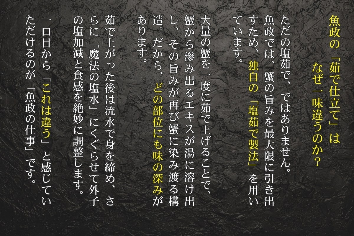 魚政では、蟹の旨みを最大限に引き出すために、独自の「塩茹で製法」を用いています。