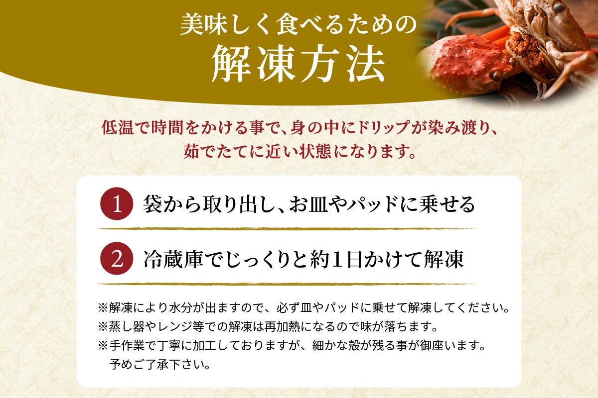セイコガニは好き。でも、捌くのが面倒なあなたへ──「蟹の宝船®」 セイコガニの魅力はよく知っている。 でも、あの小ささゆえに捌くのが大変で、食べるまでにひと苦労……。 そんな声に応えるかたちで誕生したのが、魚政の商標登録商品「蟹の宝船®」です。 内子・外子・蟹身を丁寧に捌き、ひとつの甲羅に美しく盛り付けたこの一艘は、 セイコガニの三味一体の美味しさを手間いらずで味わえる贅沢な甲羅盛り。 ■ 解凍するだけで、ごちそう完成 冷蔵庫で一晩解凍するだけ。捌く手間も、調理の手間も一切不要。 すぐにそのまま、酒の肴やご飯のお供にお楽しみいただけます。 ■ アレンジも自由自在 ・あつあつご飯にのせて、付属のダシをかければ“セイコガニ丼”に ・雑炊のトッピングとして ・グラタン・パスタ・カニクリームコロッケなどのアレンジ料理にも活躍 ・食べ終えた甲羅で「甲羅酒」にも ■ 贈り物にも、自分へのご褒美にも 真空パック+化粧箱入りで保存しやすく、見た目にも上品。 ギフト用にも、ご自宅でのちょっとした贅沢にもぴったりです。 ── 魚政の「蟹の宝船®」は、 セイコガニの美味しさを“捌かず”“手間なく”“自在に楽しめる”、新しいスタイルのごちそう。 そしてそのスタイルをいち早く形にした、甲羅盛りのパイオニア・魚政が誇る一艘です。 確かな目と職人の技から生まれる、美しく、濃密な一皿をぜひお楽しみください。 ★ 美味しく食べるための解凍方法 袋から取り出し、冷蔵庫でじっくりと約1日かけて解凍してください。 低温で時間をかけることで、身の中にドリップが染み渡り、茹でたてに近い状態になります。 水分が出てくるので、必ず皿やパッドに乗せて解凍してください。 事業者:株式会社 魚政 【注意事項】 ※掲載画像はイメージです。実際の商品とはサイズや姿が異なる場合がございます。 ※手作業で仕上げているため、まれに細かな殻が残ることがございます。