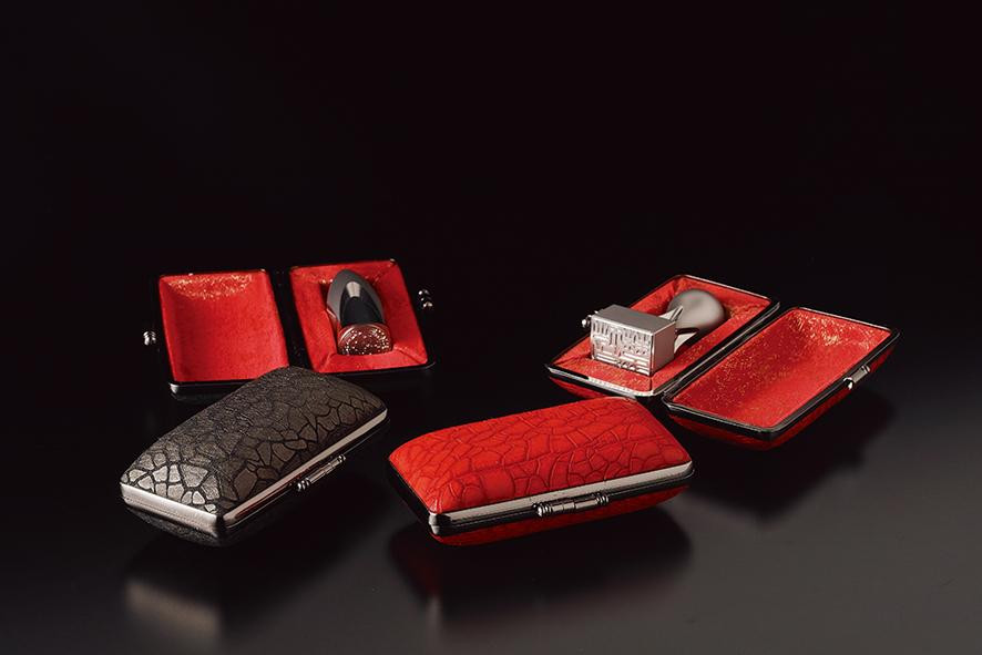 印章ケースは、外側にひび割れ模様の本革を使用し、内側には縁印オリジナルの丹後ちりめんを使用しています。 大切な印章を持ち運ぶ際も、スタイリッシュでお洒落なケースで是非。 赤と黒の2色からお選いただけます。
