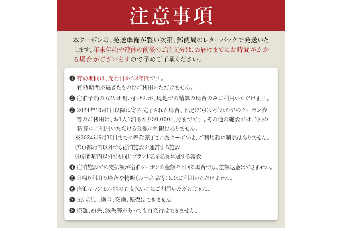 【京丹後市観光公社】京丹後宿泊クーポン 3,000円券×1枚 京都府…10,000 円 ≪2024年10月1日以降のお申込について≫ ふるさと納税制度の改正により、下記の宿泊施設でのクーポン券等のご利用は、お1人1泊あたり50,000円分までとなります。 ※2024年9月30日までに寄附完了された場合は、ご利用額に制限はありません。 ※複数種類のクーポン等を組み合わせる場合でも、ご利用いただける上限額はお1人1泊あたり50,000円分までとなりますのでご注意ください。 対象施設: 炭平旅館、天女の里、ホテルリゾーピア久美浜、デュラクスアウトドアリゾート京丹後久美浜LABO ご利用の例: 宿泊料金120,000円の部屋に2人で泊まる(1泊)場合 ふるさと納税の宿泊クーポン等が利用できるのは、100,000円分まで(50,000円分×2人) クーポンが利用できるお宿は、京丹後市観光公社 公式サイトからご確認いただく、もしくは、京丹後市観光公社までお問合せください。 (お問合せ先) 事業者 :京丹後市観光公社 連絡先 :0772-72-6070 営業時間:08:30-17:15 定休日 :日曜・祝祭日・年末年始など 【注意事項】 【1】有効期間は、発行日から2年間です。有効期間が過ぎたものはご利用いただけません。 【2】宿泊予約の方法は問いませんが、現地での精算の場合のみご利用いただけます。 【3】2024年10月1日以降に寄附完了された場合、下記(ア)(イ)いずれかでのクーポン券等のご利用は、お1人1泊あたり50,000円分までです。その他の施設では、1回の精算にご利用いただける金額に制限はありません。 ※2024年9月30日までに寄附完了されたクーポンは、ご利用額に制限はありません。 (ア)京都府内以外でも宿泊施設を運営する施設 (イ)京都府内以外でも同じブランド名を名称に冠する施設 【4】宿泊施設での支払額が宿泊クーポンの金額を下回る場合でも、差額返金はできません。 【5】日帰り利用の場合や物販(お土産品等)にはご利用いただけません。 【6】宿泊キャンセル料のお支払いにはご利用いただけません。 【7】払い戻し、換金、交換、転売はできません。 【8】盗難、紛失、滅失等があっても再発行はできません。 - 常温便