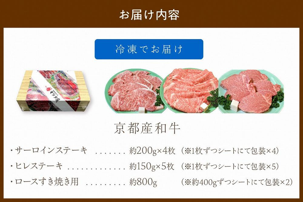 | 容量 | ・京都産和牛 ヒレステーキ 約750g(約150g×5枚) ※1枚ずつシートにて包装×5 ・京都産和牛 サーロインステーキ 約800g(約200g×4枚) ※1枚ずつシートにて包装×4 ・京都産和牛 ロースすき焼き800g ※約400gずつシートにて包装×2 |