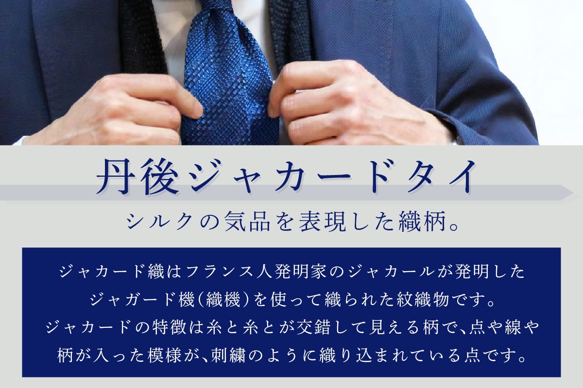 丹後ジャカードタイは手織りのジャカード機が表現する「流れるような上品な織り柄」「生地の重厚感」「シルクの光沢」がマッチしたアイテムです。