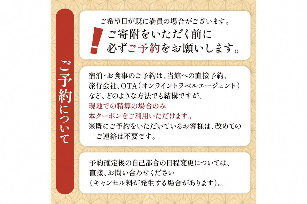 ・宿泊・お食事のご予約は、当館への直接予約、旅行会社、OTA(オンライントラベルエージェント)など、どのような方法でも結構ですが、現地での精算の場合のみ本クーポンをご利用いただけます。※既にご予約をいただいているお客様は、改めてのご連絡は不要です。