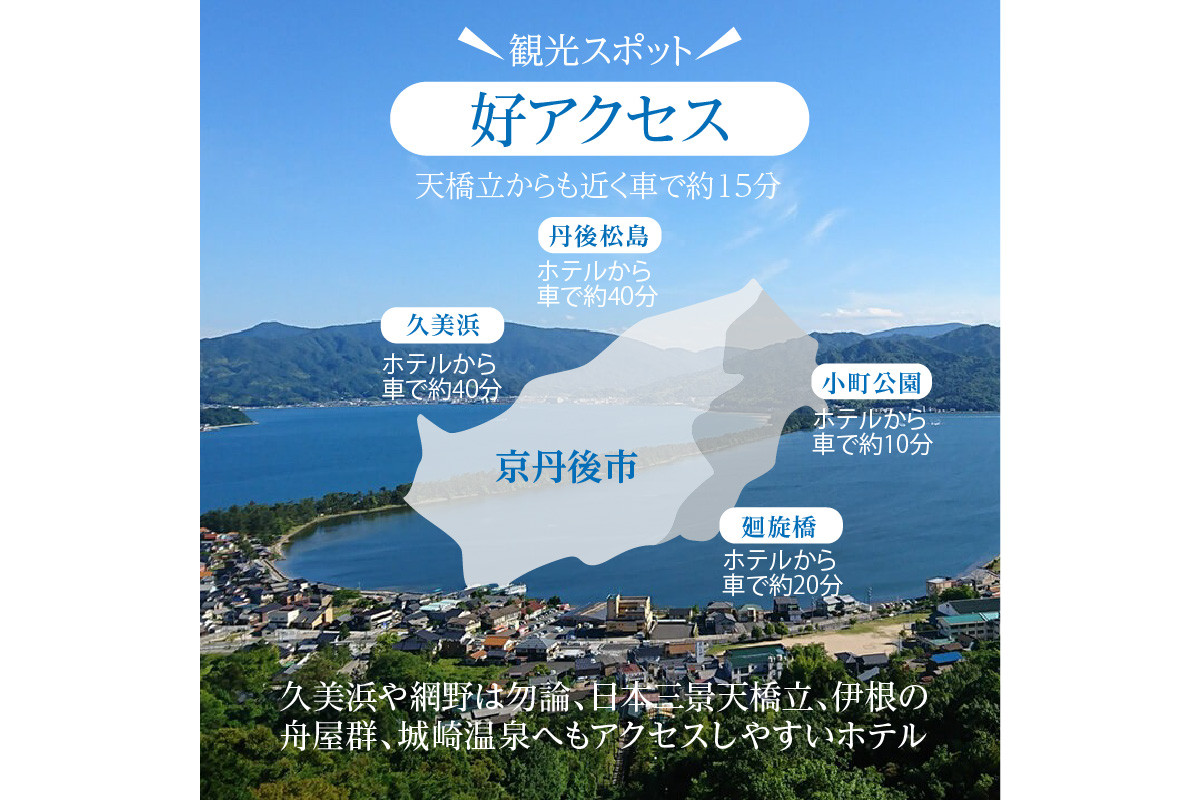 近隣には、日本三景のひとつ「天橋立」や、日本のヴェネチアと称される「伊根の舟屋」、1300年の歴史がある「城崎温泉」など、有名観光地が多数点在しています。