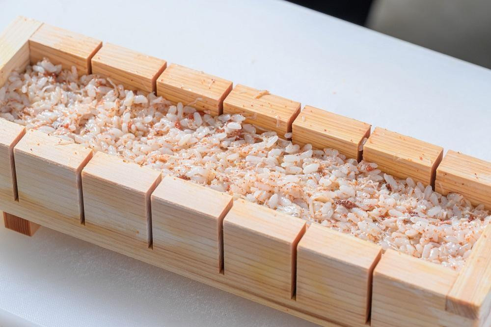 酢飯には、『純米富士酢』を使用。京都・丹後の豊かな土壌と清らかな水で生まれた地元産の酢です。その原料となるお米は、地元・丹後の山里で愛情込めて栽培され、製法には変わらない伝統が守られています