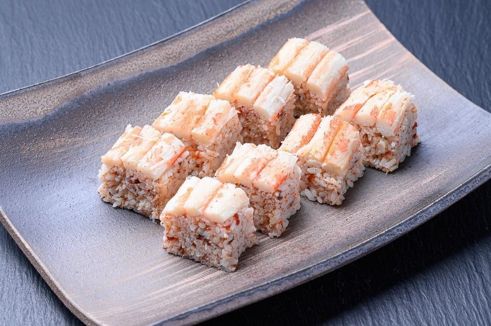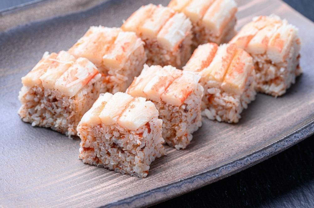 恋蟹寿司は、雄の松葉ガニの濃厚な身と雌のセイコガニの味わい深い内子外子を組み合わせた一品。