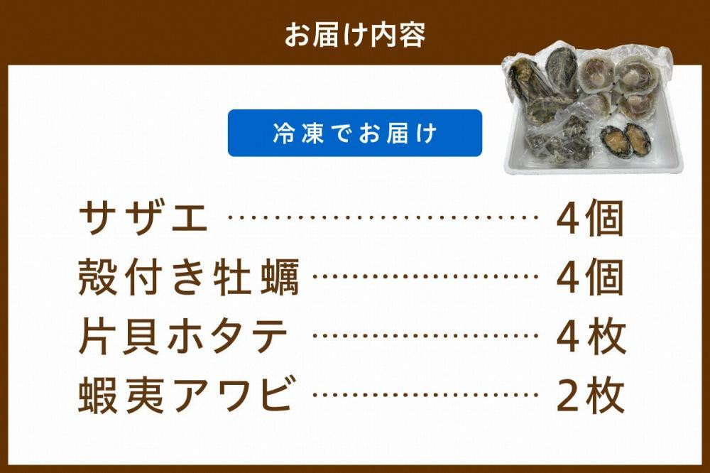| 容量 | 【1】サザエ×4個(京丹後産) 【2】殻付き牡蠣×4個(京丹後産) 【3】片貝ホタテ × 4枚(北海道産) 【4】蝦夷アワビ×2枚(韓国産) |