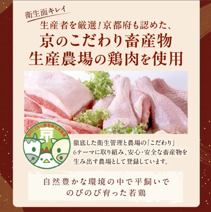 ”美味しい鶏肉を食べてもらいたい”。そのために、すべて職人の手捌きで鶏をカットしておりますが、かける思いは鶏の選び方からも。徹底した衛生管理と農場の「こだわり」6テーマに取り組み、安心・安全な畜産物を生み出す農場として登録されている「京のこだわり畜産物生産農場」の鶏肉を使用しております。