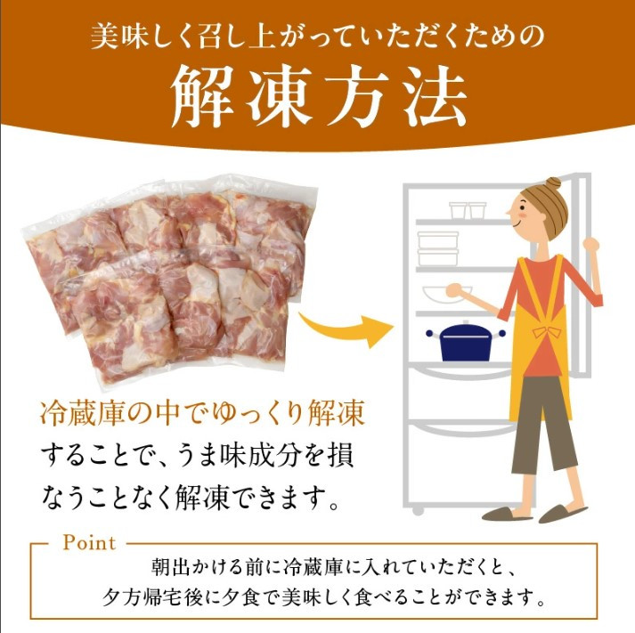 冷凍された鶏肉を美味しく召し上がって頂くには冷蔵庫の中でゆっくり解凍することで、うま味成分を損なうことなく解凍できます。