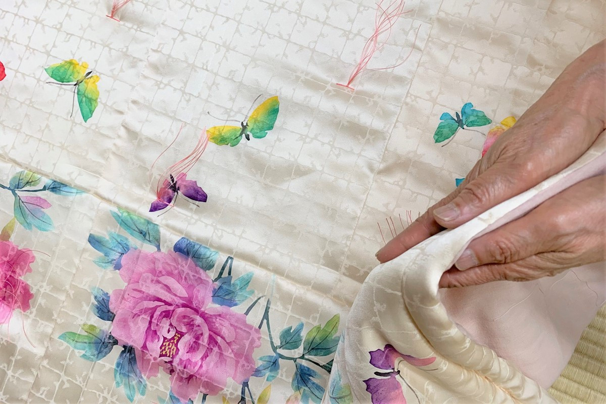 思い出の着物の生地を使って肌掛ふとんにリメイクします。